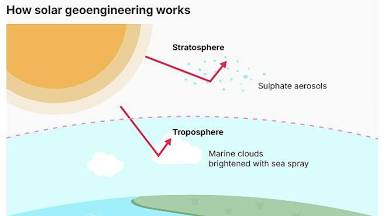 These include stratospheric aerosol injection, where fine particles are dispersed into the upper atmosphere, and marine cloud brightening, which uses sea-salt particles to increase cloud reflectivity.